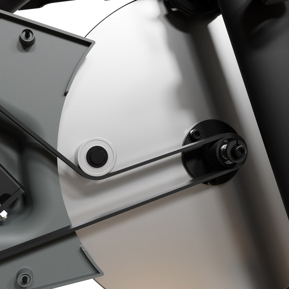 Das Bike zeichnet sich durch seine robuste und stabile Konstruktion aus, mit einem Rahmen aus Stahlrohren, der durch einen Roboterprozess geschweißt wurde. Das 20 kg schwere Aluminium-Schwungrad sorgt für eine sanfte und flüssige Trägheit und ermöglicht ein komfortables sowie realistisches Pedalieren. Die Poly V®-Riemenübertragung gewährleistet eine größere Kontaktfläche und einen effizienten Krafttransfer.